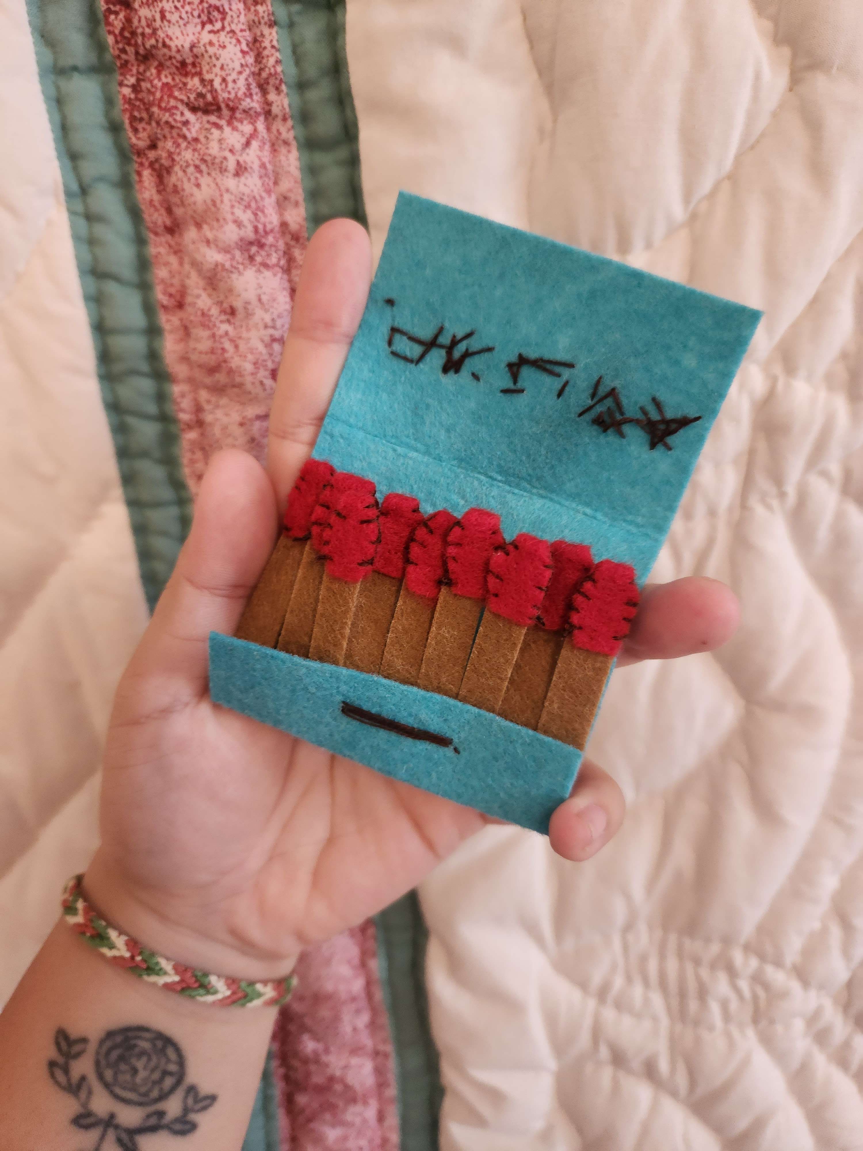 These are hand sewn out of 100% wool felt. Each is handstitched with their own uniqueness and loving details. Each matchbook can be displayed as a little work of art, kept as a little pocket pet or just a quirky little decoration!