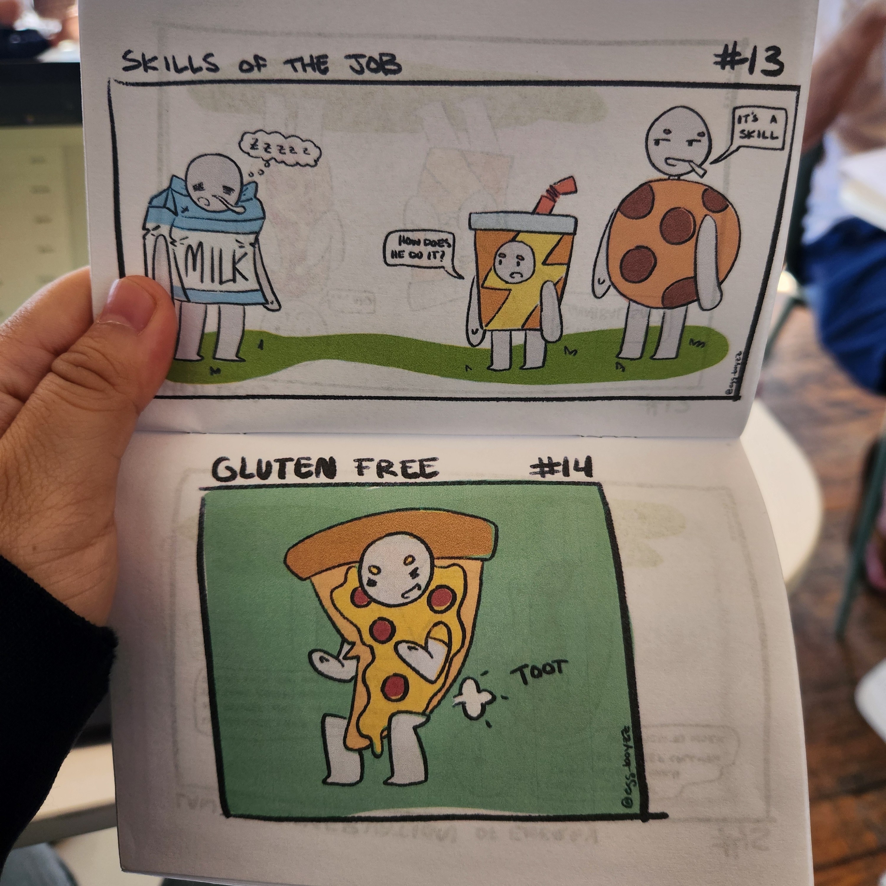 A 10-page zine of the Mascots. A group of characters are mascots working daily along with their adventures. Short little comics of the Mascots working.