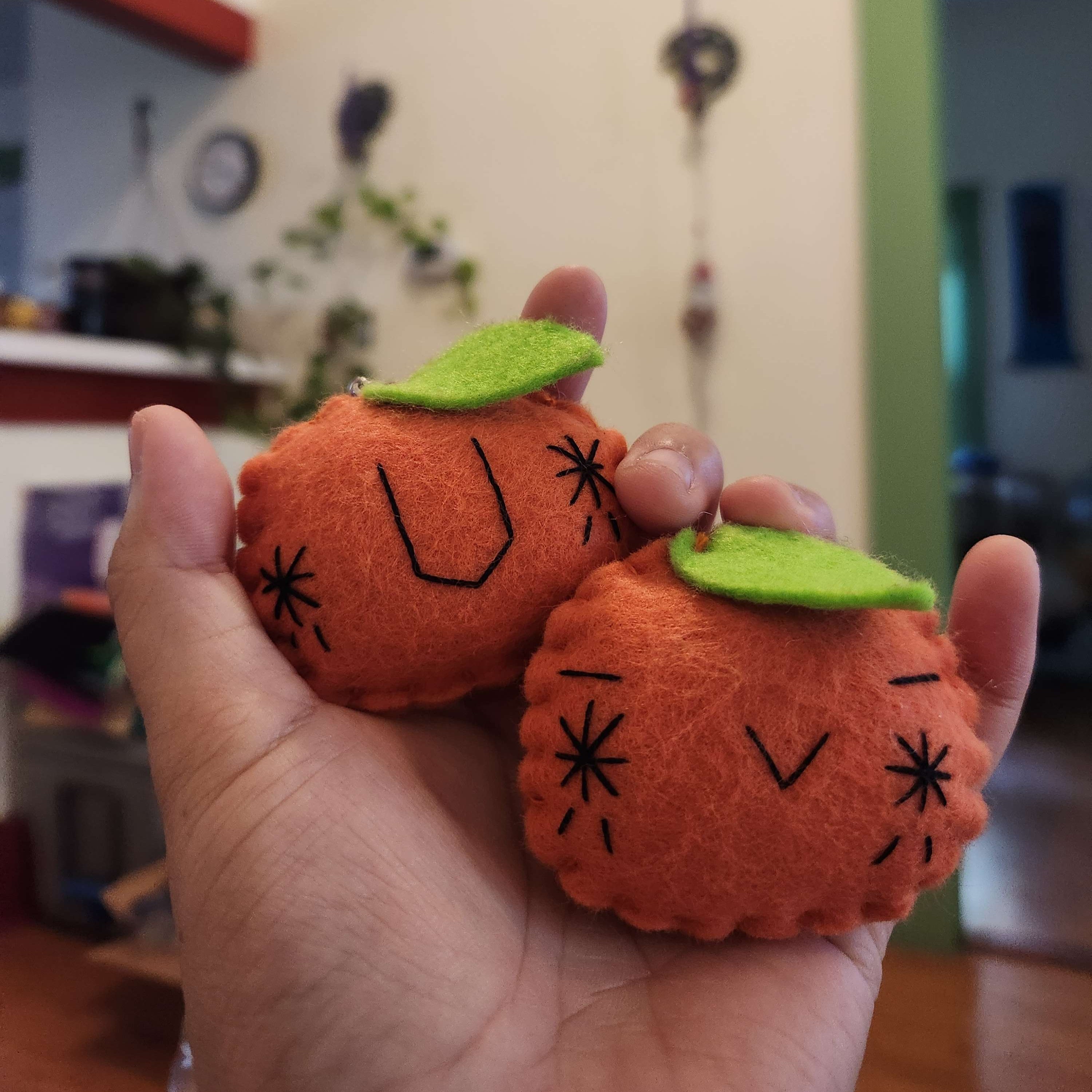 These oranges are hand sewn out of 100% wool felt. Each is handstitched with their own uniqueness and loving details. Each orange can be displayed as a little work of art, kept as a little pocket pet, or just a quirky little decoration!