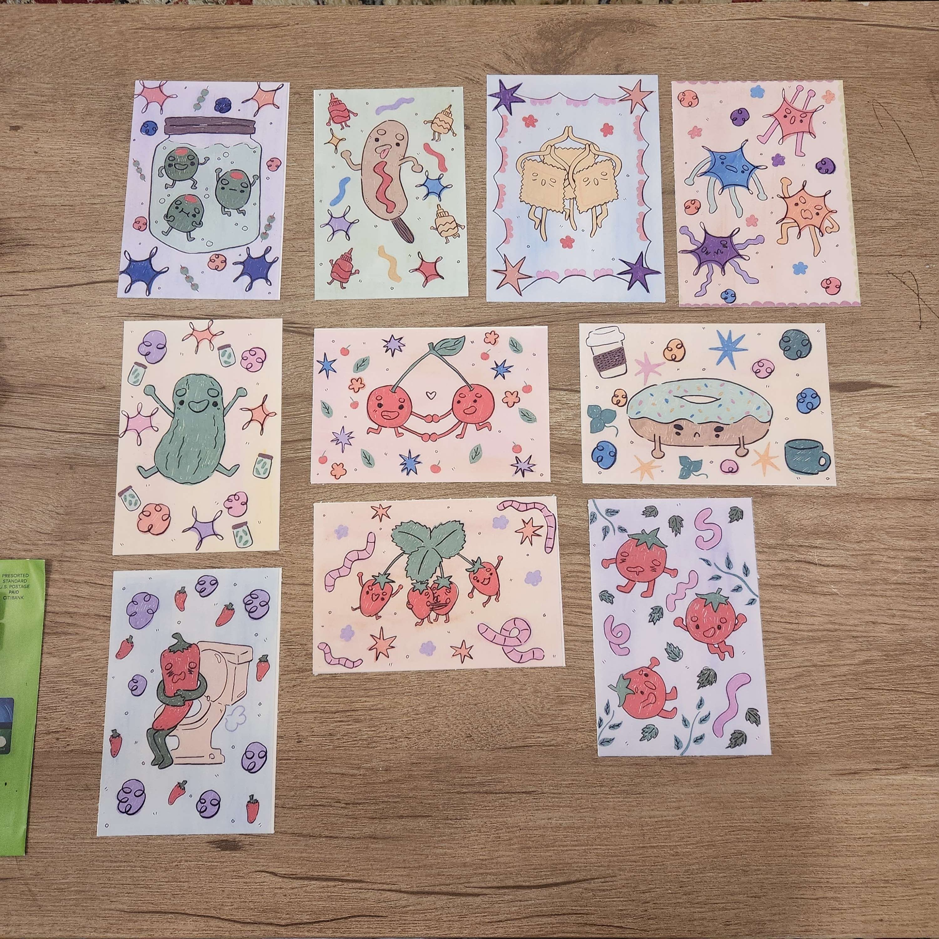 Small prints! Each print is hand cut and printed at home by me. These small prints are little pieces of my own illustrations for you to bring home and decorate your walls. The prints are about 4x6 inches but some may vary in size depending on the print. None are bigger than 4x6 inches.