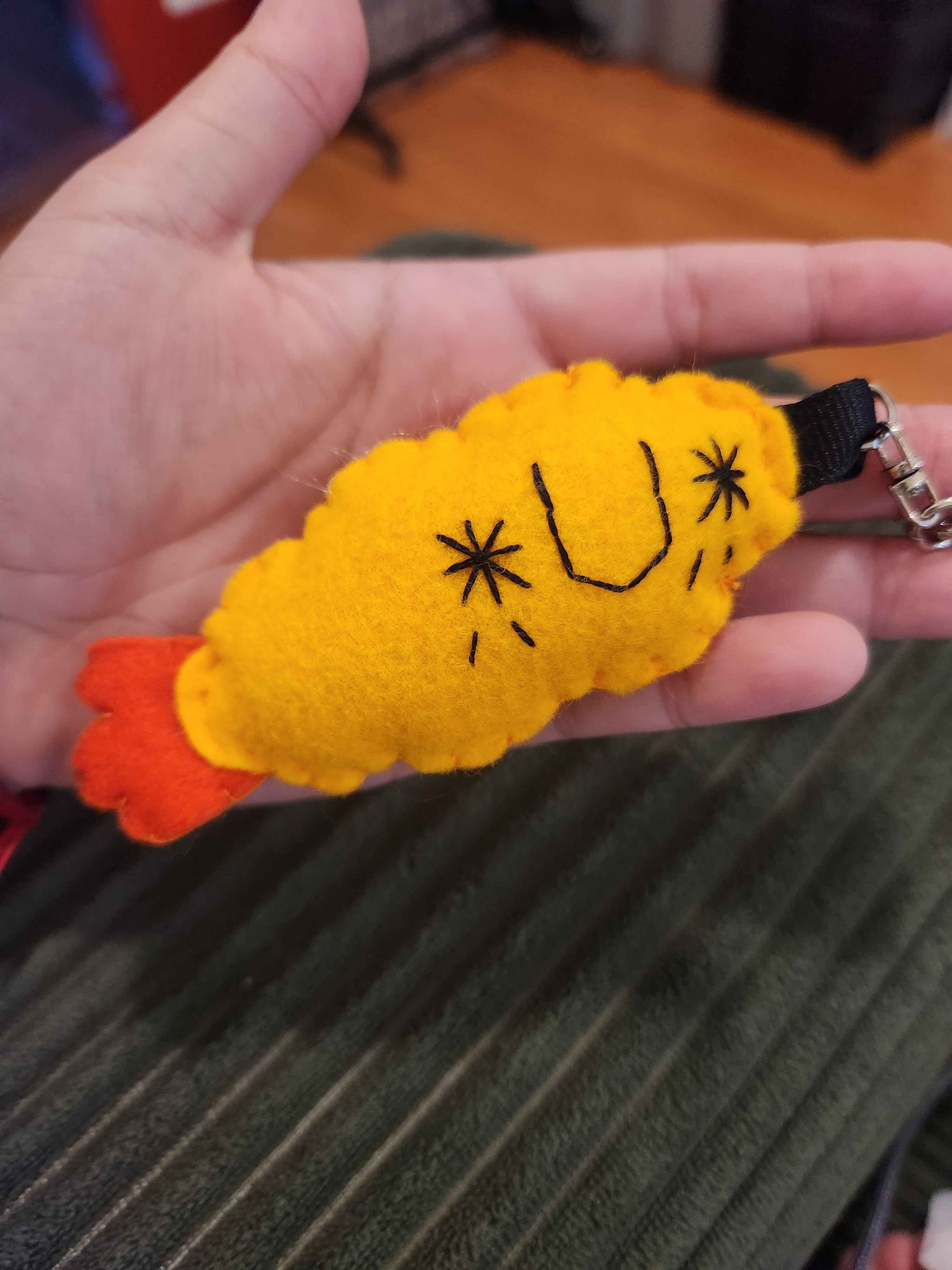 These shrimp are hand sewn out of 100% wool felt. Each is handstitched with their own uniqueness and loving details. Each shrimp keychain can be displayed as a little work of art, kept as a little pocket pet or just a quirky little decoration!