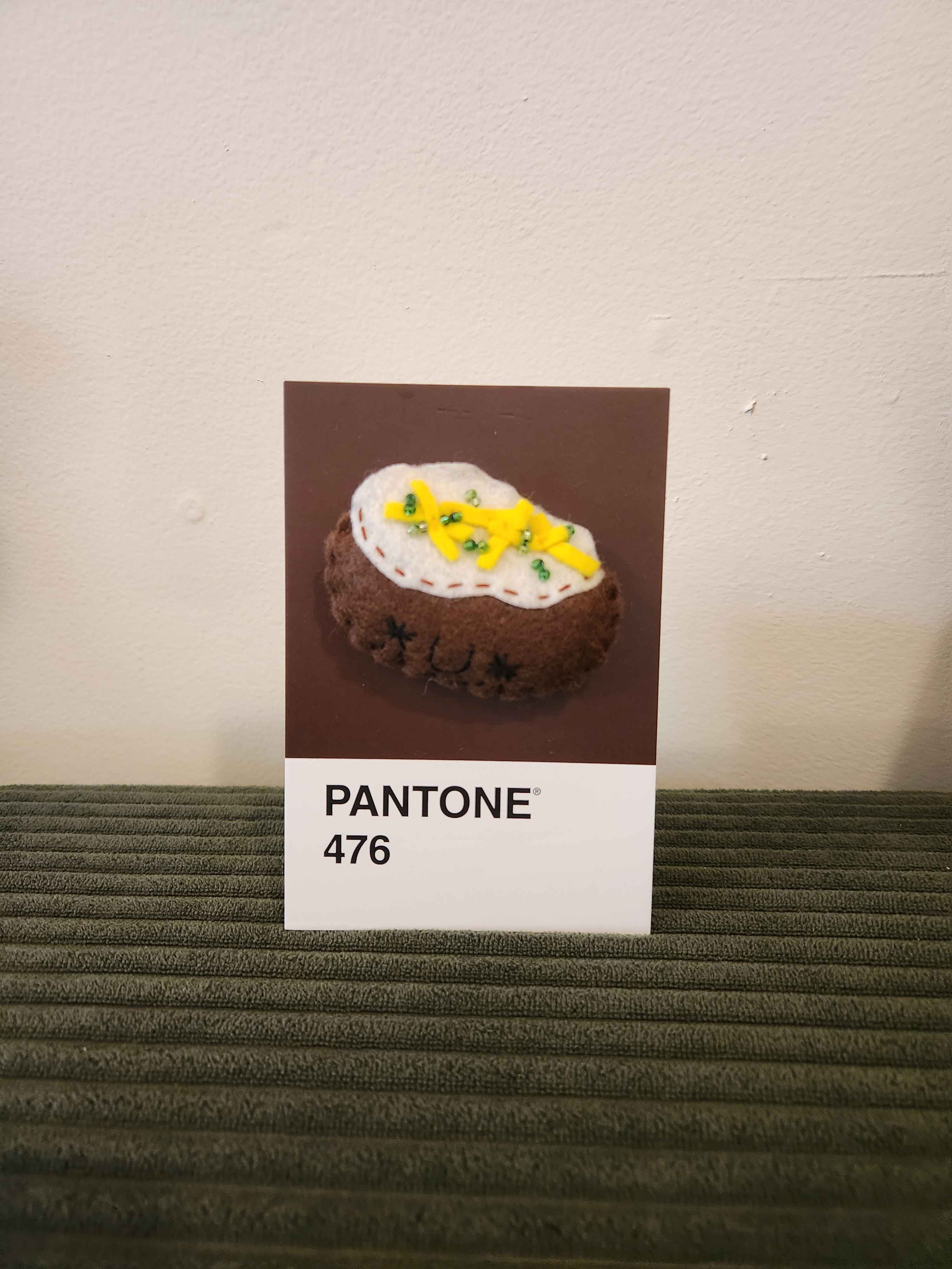 This one-of-a-kind Pantone color card wall art depicts a baked potato with all the fixings! It is all hand-sewn with a wool blend felt sewn and glued to a Pantone color card. This art piece is only 4x6 inches.